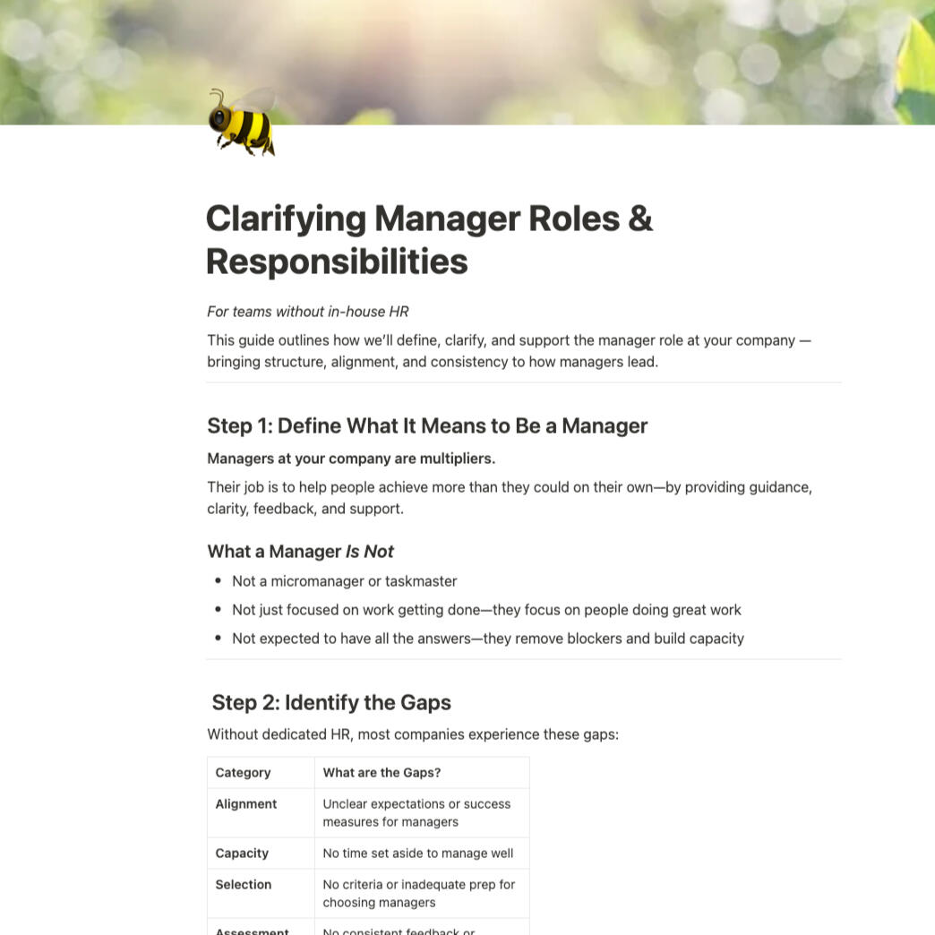 Nope. It works for any manager who needs more clarity or rhythm in their role—whether they’re brand new or juggling multiple responsibilities.Can I customize it for my team?